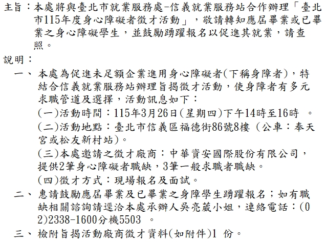【徵才活動】臺北市115年度身心障礙徵才活動